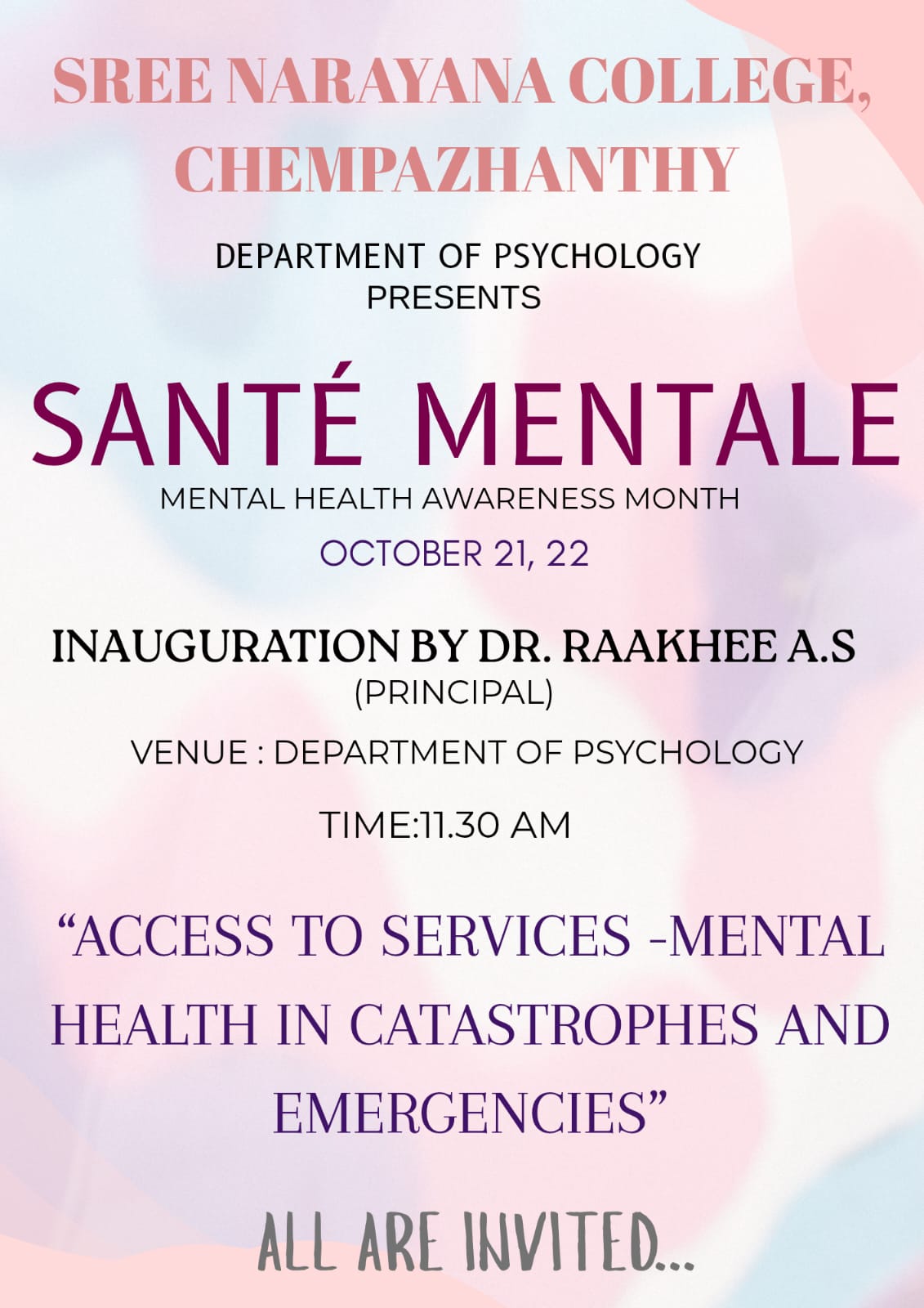 The programme commenced with a prayer, followed by the Welcome Address delivered by Prof. (Dr.) Manu Remakant, Head of the Department of English. The Presidential Address was delivered by Dr. Raakhee A S, Principal of the College.