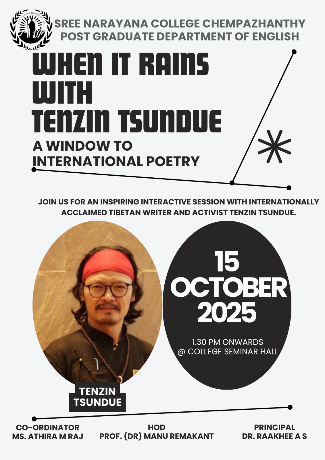 The Department of English organised an Interactive Meet with International Writer and Activist Tenzin Tsundue titled “When it Rains with Tenzin Tsundue – A Window to International Poetry” on 15 October 2025 at 1:30 PM in the College Seminar Hall.
