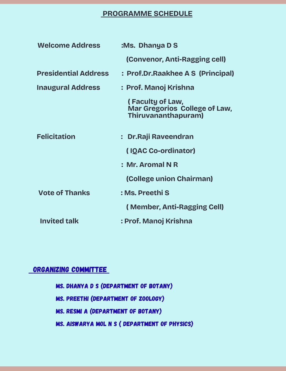 The event Began with a Prayer by IInd year BSc Student Arathy Anil and Followed by Welcome Address by Ms. Dhanya D S, Co-Ordinator of Anti-ragging cell. The Principal Prof. Dr. Rakhee A S delivered the presidential address. This was followed by ceremonial Lamp lighting by the Chief Guest Prof. Manoj Krishna, then he delivered the inaugural talk. Felicitations were offered by the IQAC coordinator Dr. Raji Raveendran and the college union Chairman Mr. Aromal N R. The inaugural function concluded with a gracious vote of thanks proposed by Preethi.