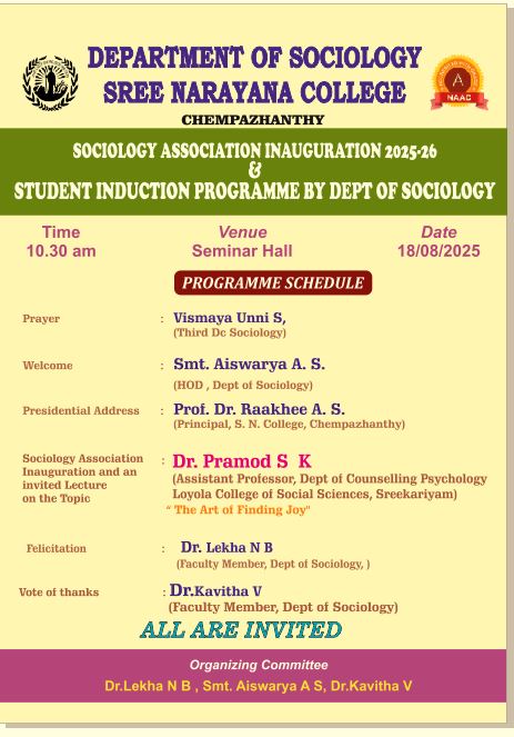 The Department of Sociology cordially invites you to the Inauguration of the Sociology Association. Your esteemed presence will be a source of inspiration and will greatly enrich the occasion.